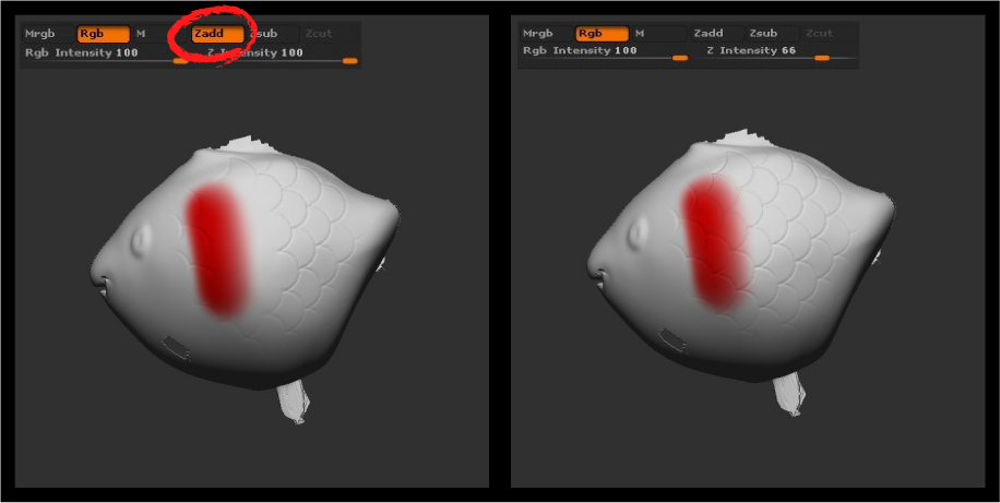 ”Zadd,Zsub”がONになったままだと、ペイントとスカルプトが同時にされてしまいます。