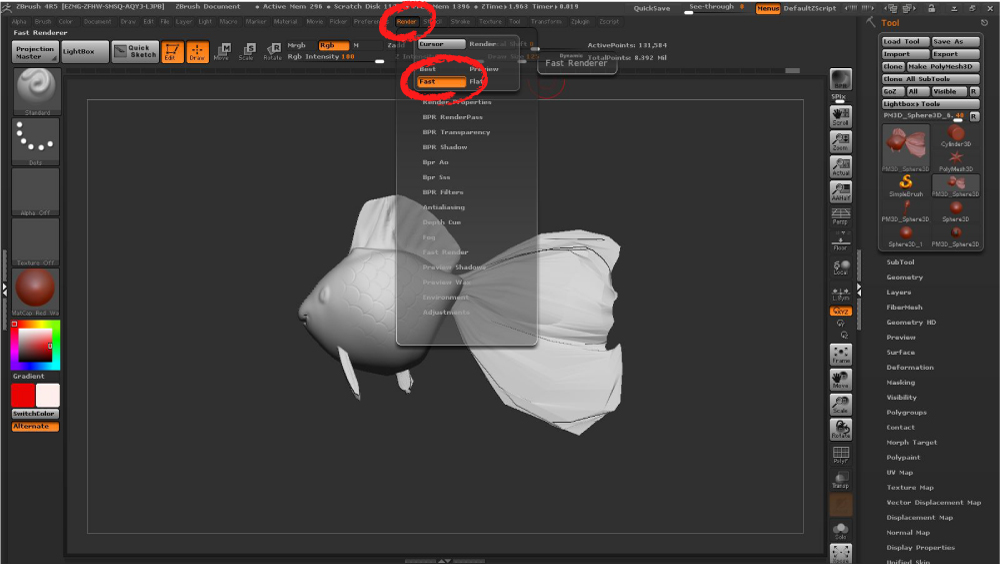 ”Fast”はマテリアルやリアルタイムシャドウがレンダリングされずにレンダリングされる機能だそう。んーはあまり良くわかりませんが、マテリアルが表示されないのでペイントしやすい。