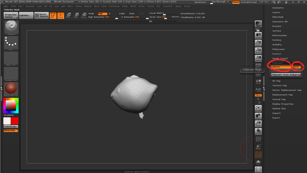 次に、Objectへのペイントを可能にする為に”Tool-Polypaint-Colorize”ボタンをONにします。