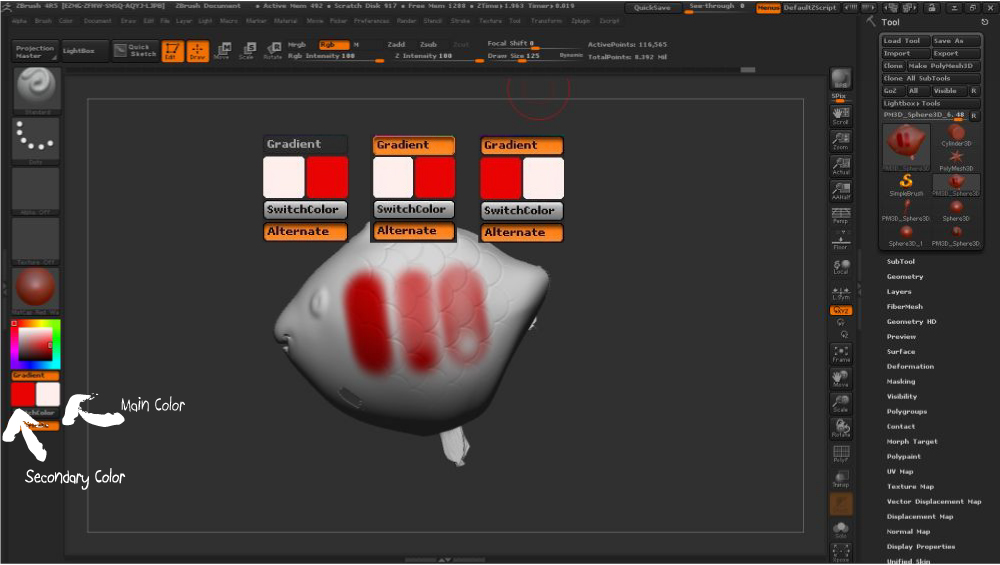 Main Color、Secondary Colorは”Switch Color”で切り替えます。”Gradient”をONにするとこんな感じでペイントできました。